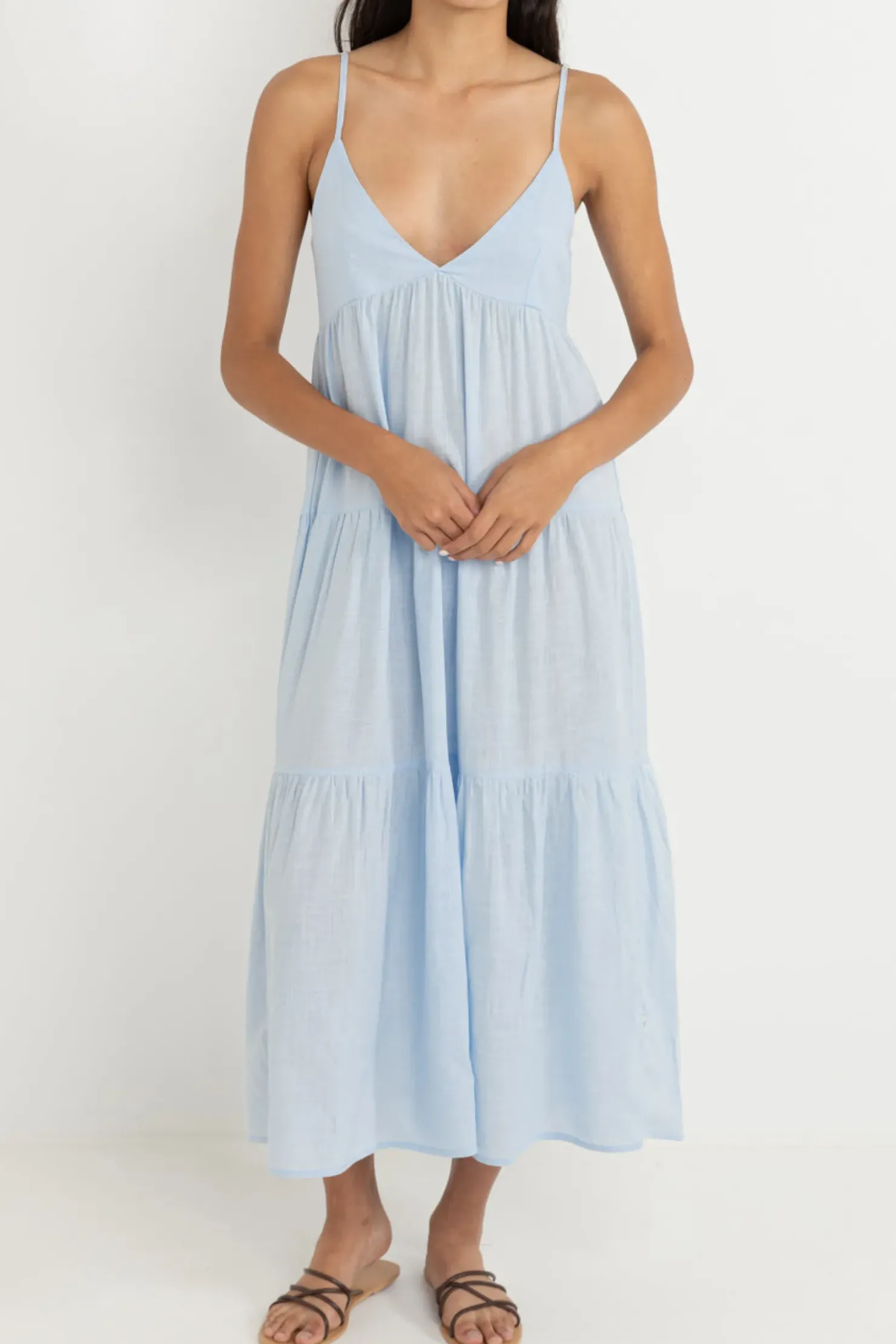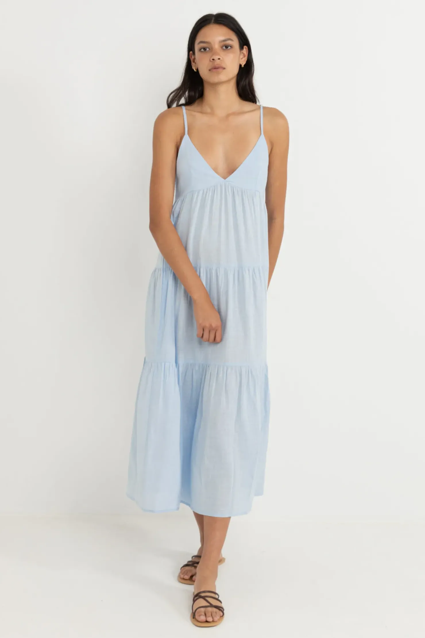 With a fitted bodice, deep V neckline and full sweeping hemline, the Classic Tiered Midi Dress is sure to make a statement. Delivering an elegant coastal design that can be worn between dinner dates, and beach walks both.