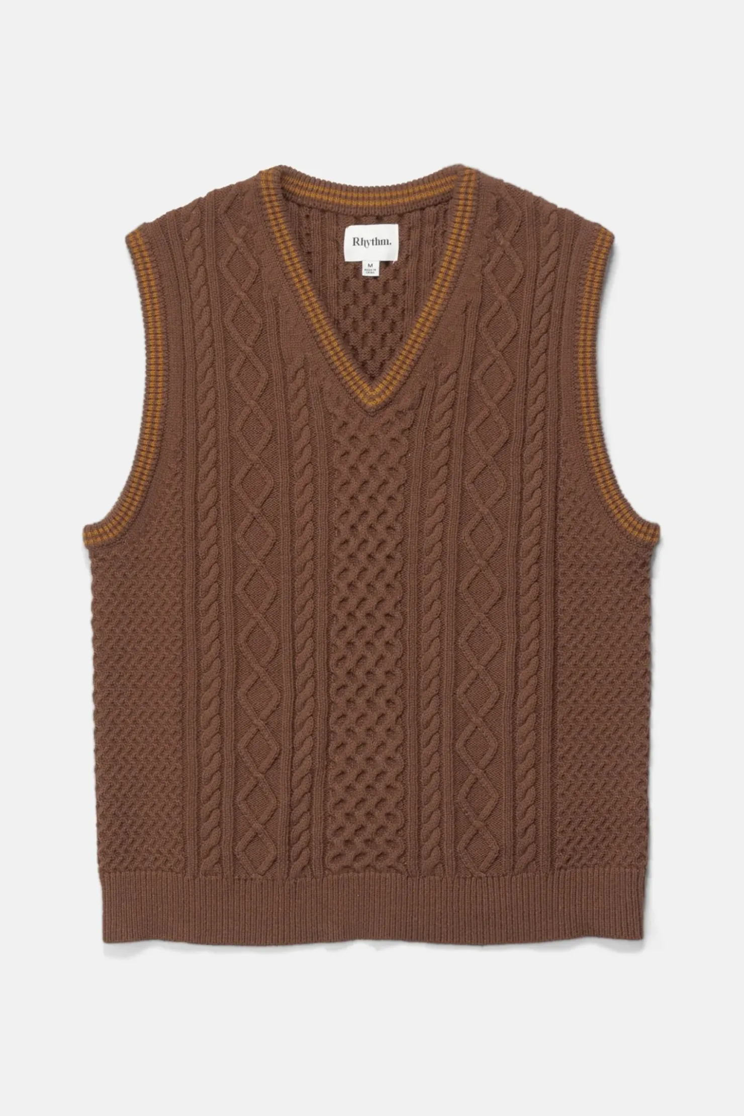 A classic with a modern twist, the Assembly Fisherman Knit Vest in Brown is accented with orange contrast stripes at the armholes and neckline. Its soft knit texture ensures both comfort and style.
