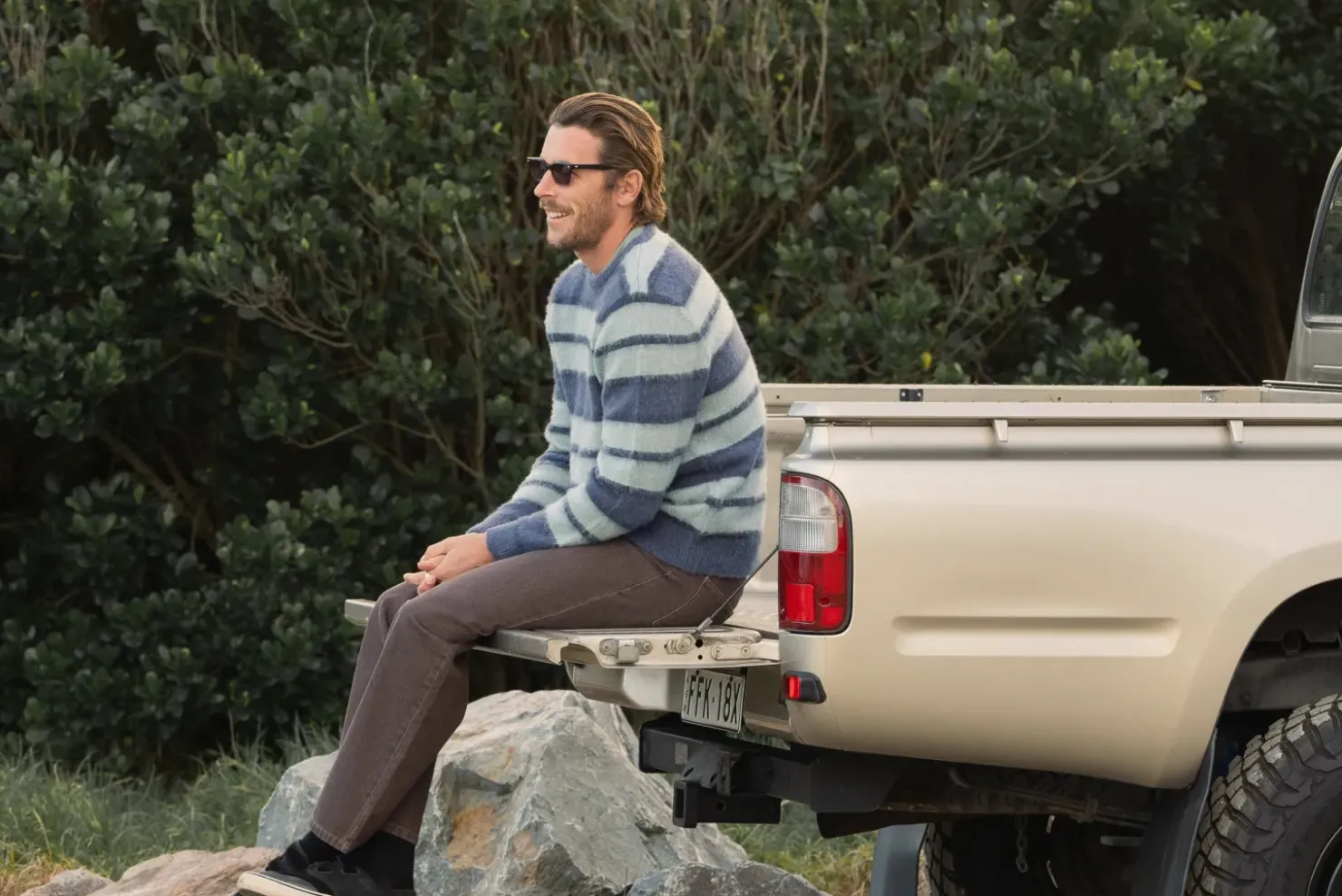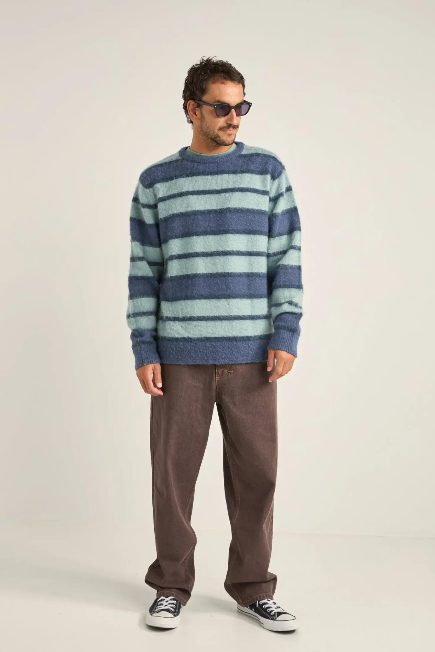 Elevate your coastal style with Harvey Mohair Stripe Knit in Blue. This regular fit, fluffy cotton knit features brushed knit detail, a classic crew neck, and signature Rhythm trims for a blend of comfort and timeless design.