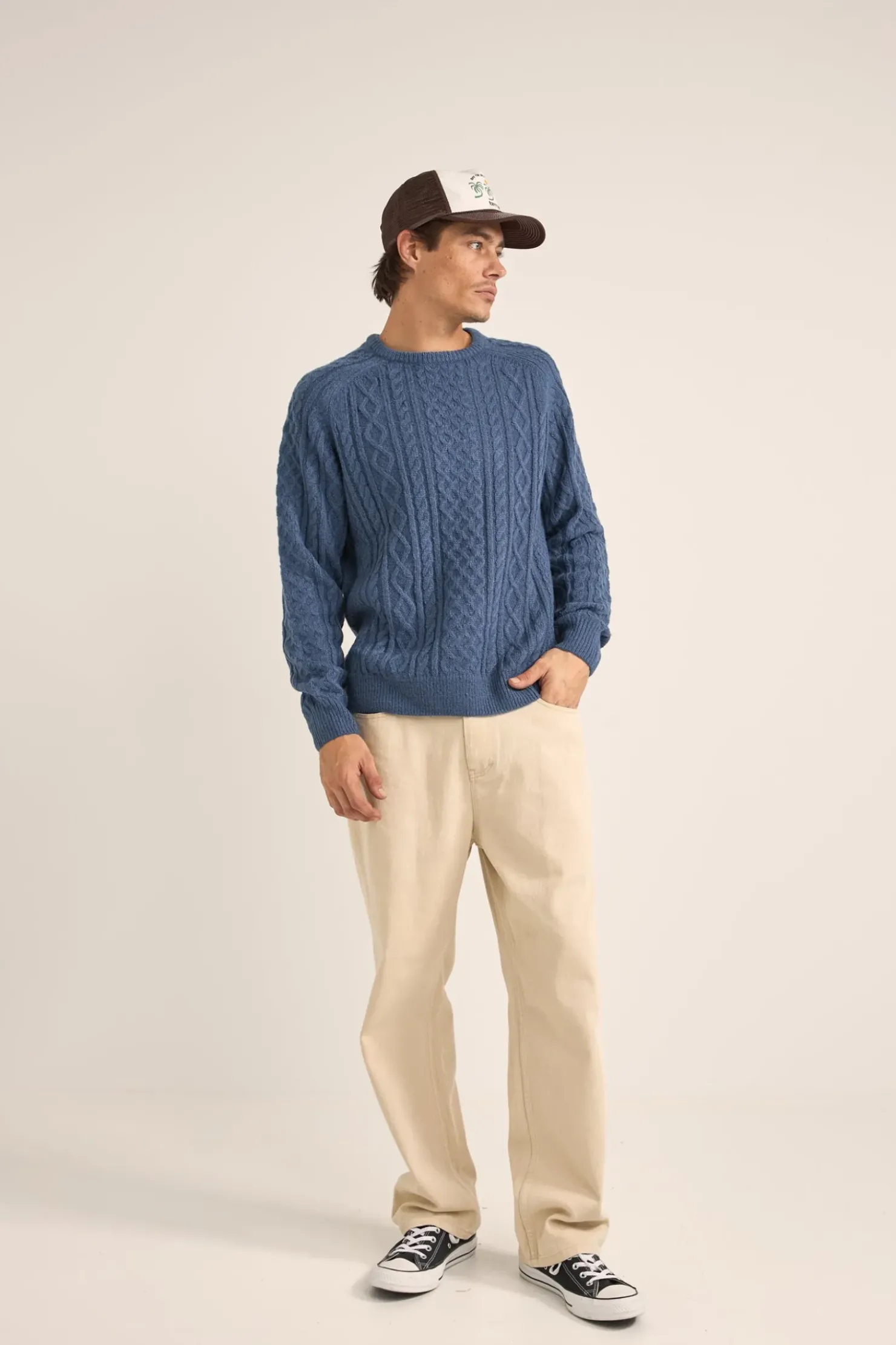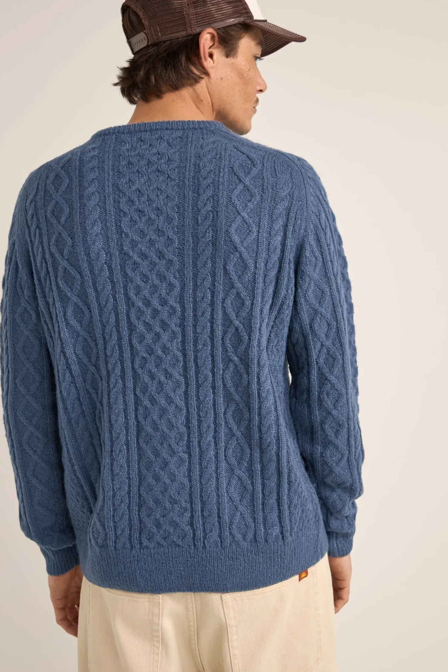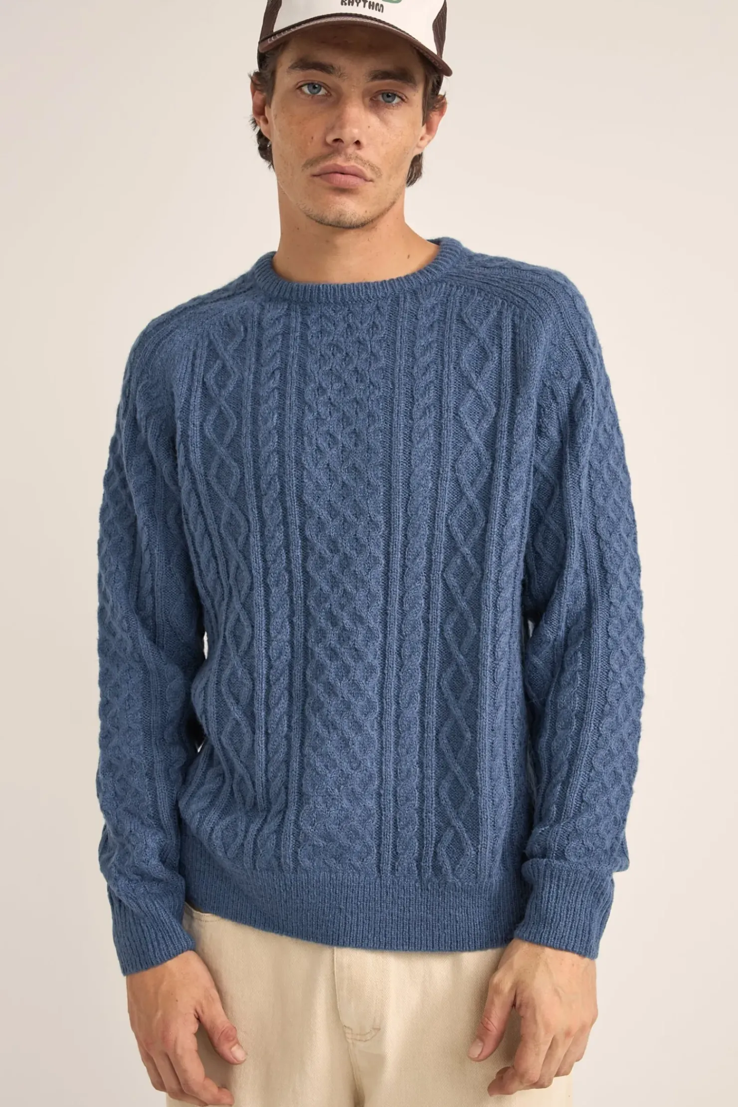 From sea-inspired adventures to warm, fire-side evenings at the bar, this luxuriously soft Slate Mohair Fisherman’s Knit is made using a blend of acrylic, nylon, wool and mohair. Inspired by the iconic retro look of traditional fisherman, it features a cable knit crew pattern, rib knit collar, and our signature Rhythm trims