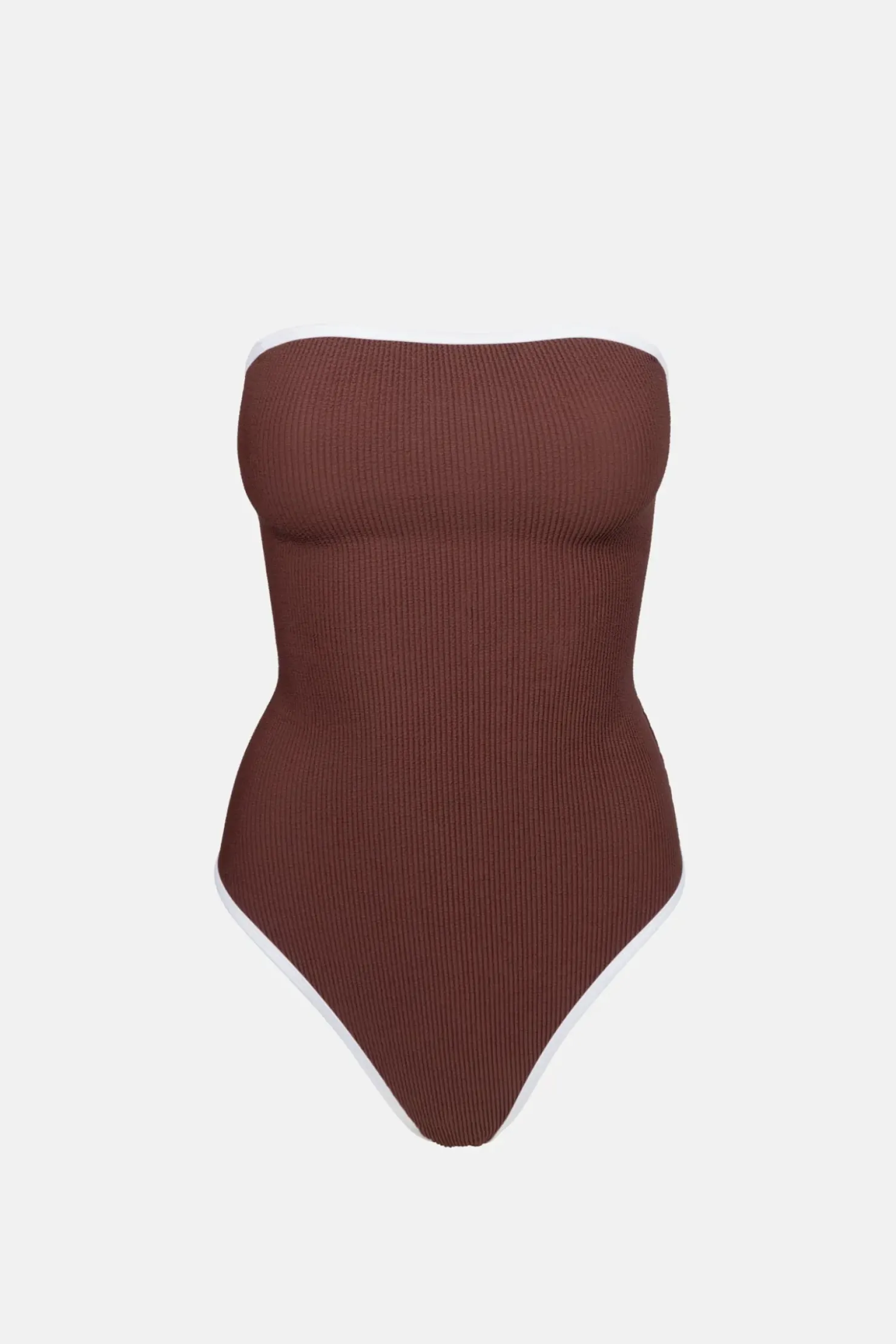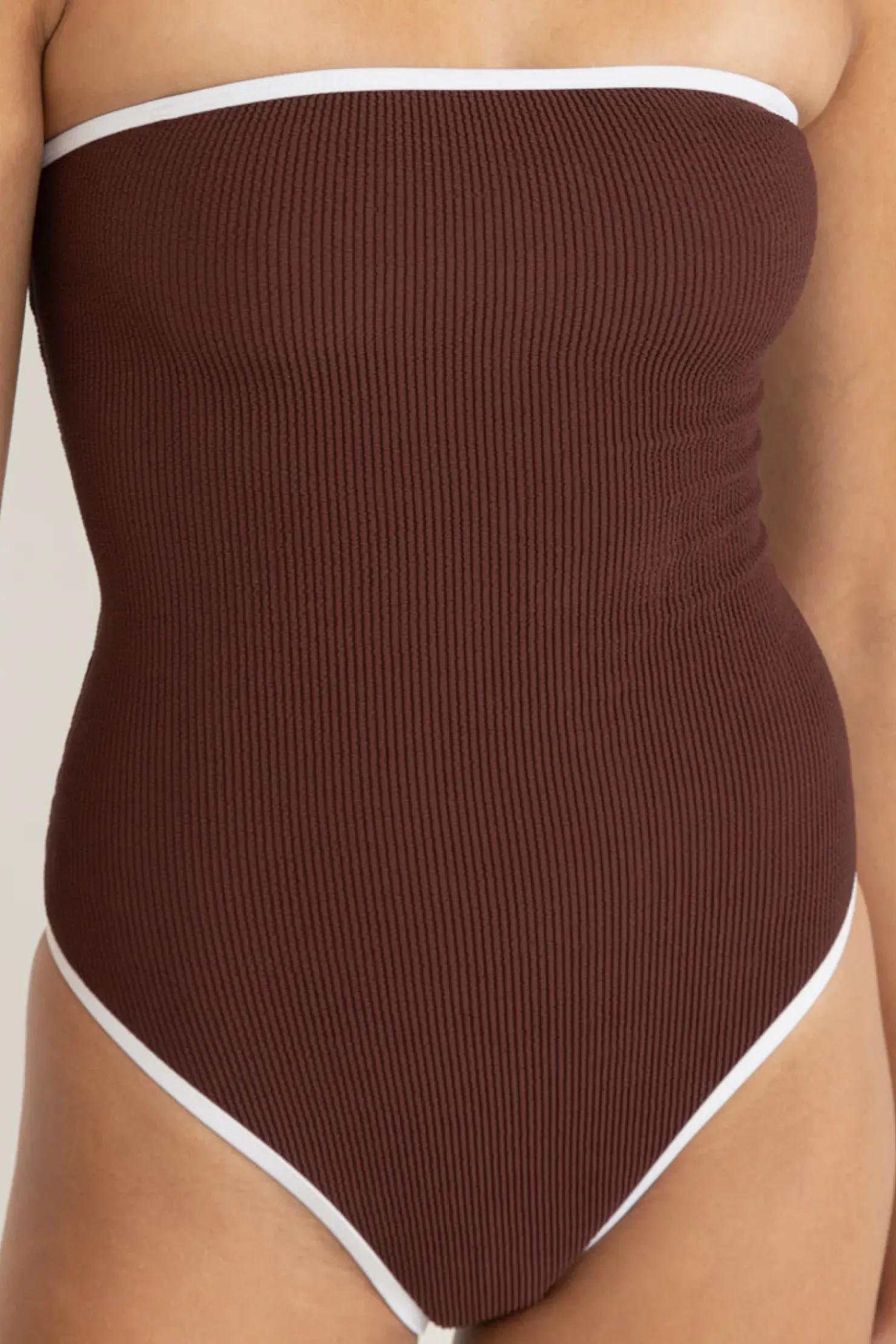 This café one-piece features moderate coverage, a high-rise fit, and black contrast binding. Adjustable straps and the Rhythm metal coin logo complete the look