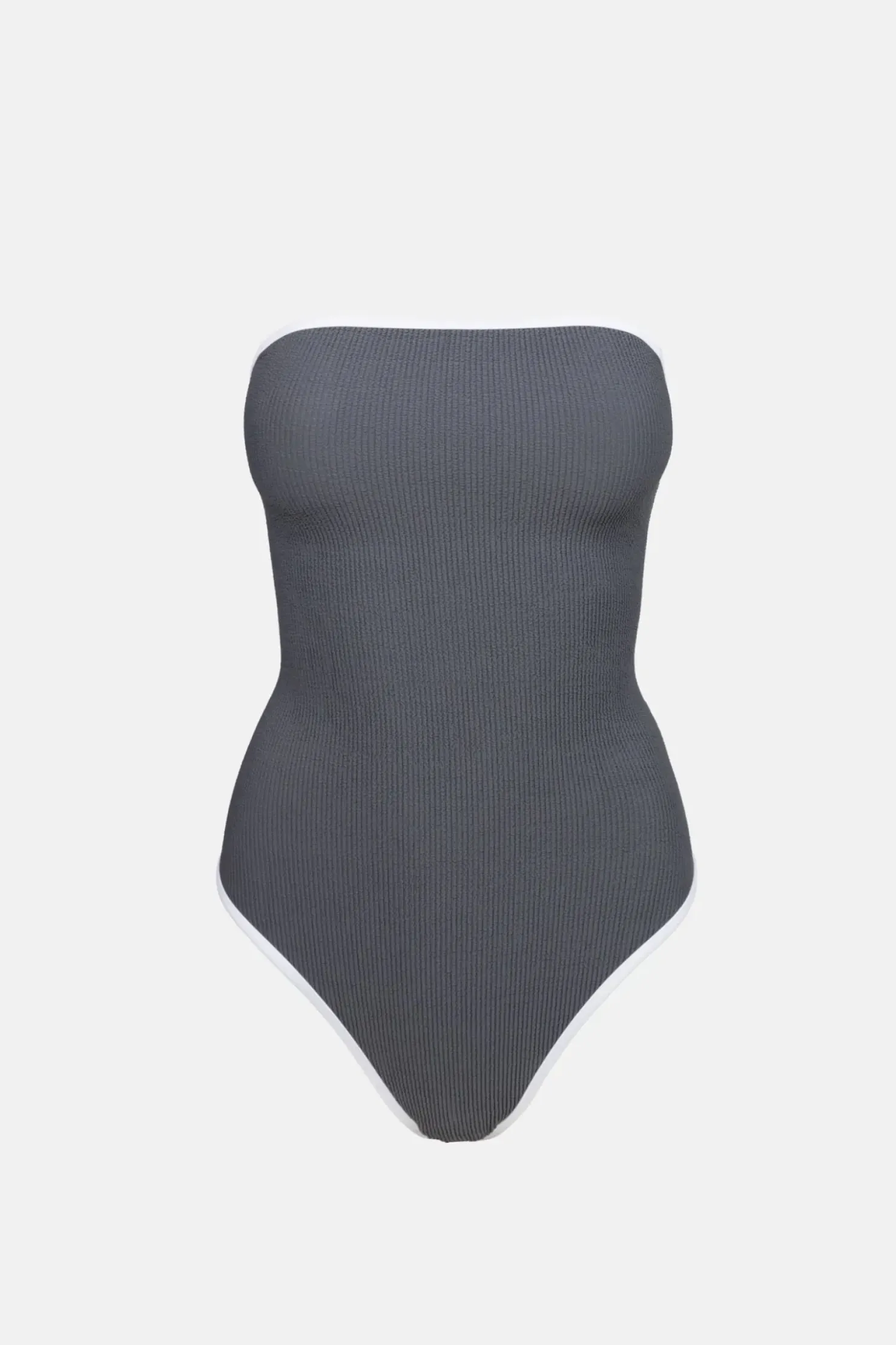 With moderate coverage and white contrast binding, this graphite one-piece features a high-rise fit and adjustable straps. Finished with the Rhythm metal coin logo.