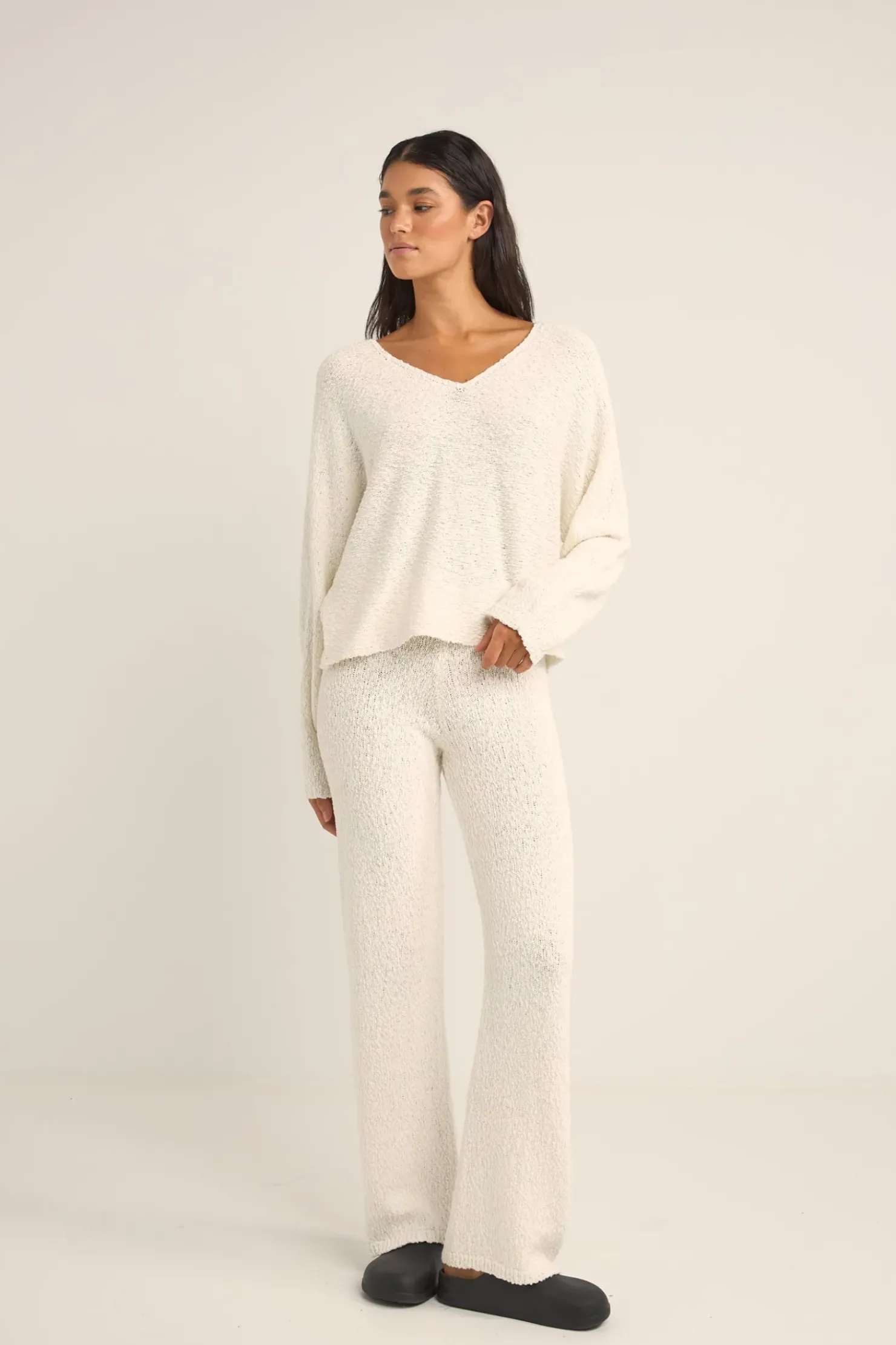 The White Adele Knit Pants are a symphony of comfort and coastal elegance. Made from 100% cotton with a boucle-like knit, these low-rise, straight-leg pants offer a lightweight and breathable option, embodying the effortless grace of seaside mornings.