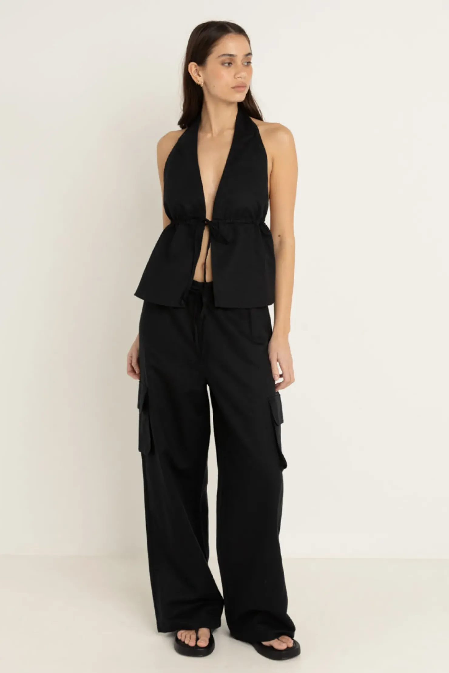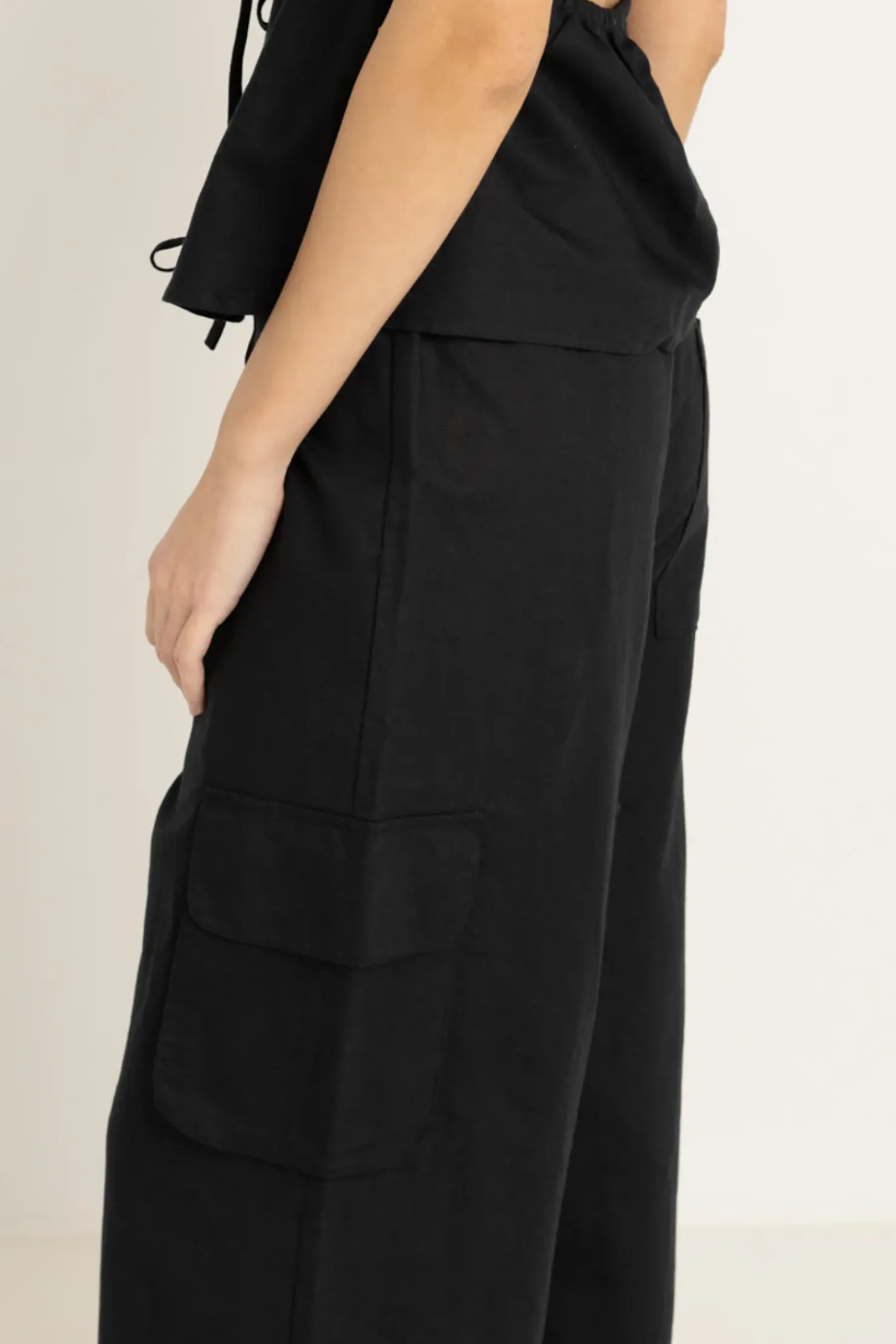 The Cove Cargo Pant in Black offers a high-waisted, relaxed fit with an elastic waistband and spaghetti tie. Perfect for effortless, laid-back style.