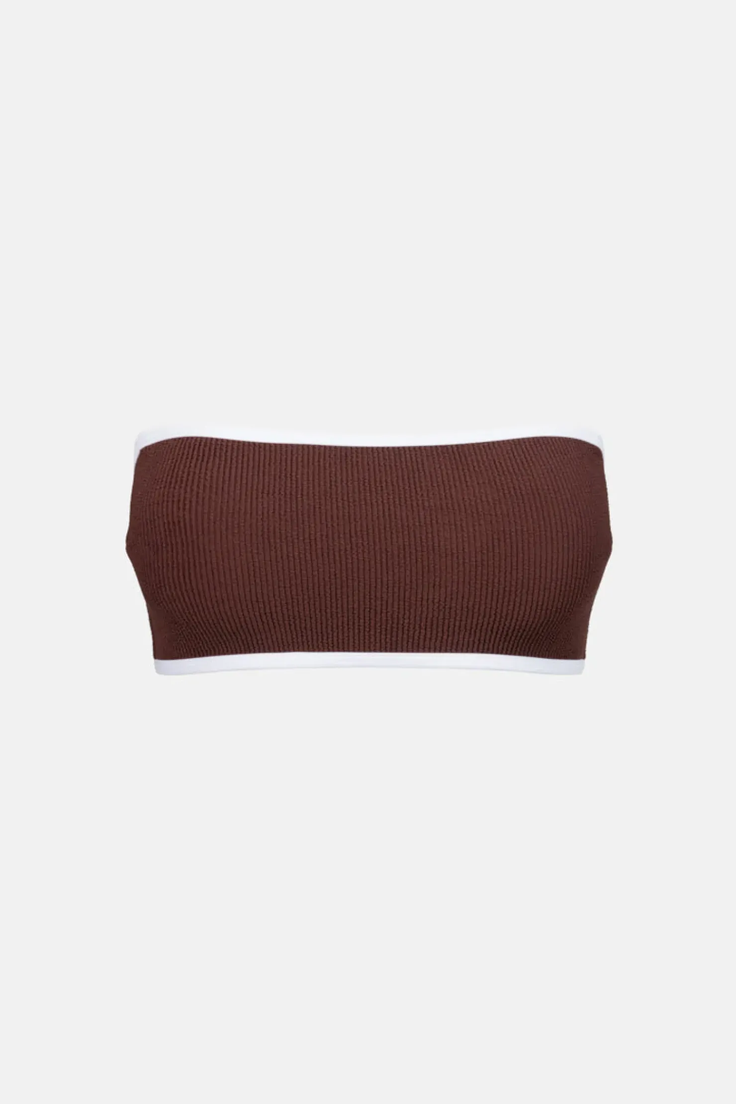 This café bandeau is ideal for A-D cup sizes with pull-on style, removable straps, and white contrast binding. Finished with a Rhythm metal coin logo for effortless beach chic.