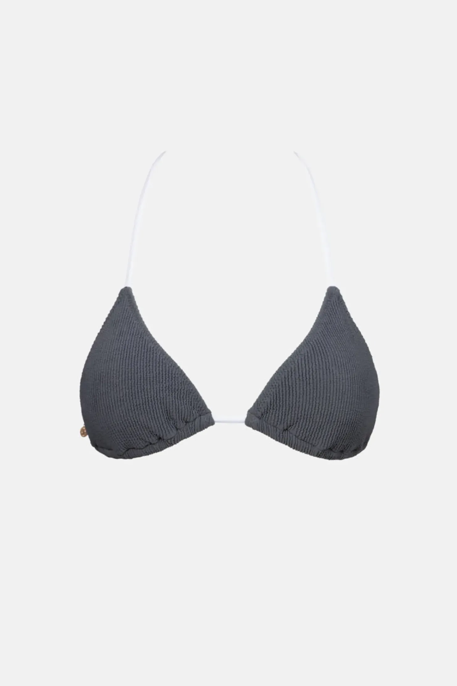Designed with removable soft cups and white contrast binding, the graphite tri top delivers comfort and style. Adjustable straps and a Rhythm metal coin logo finish the look.