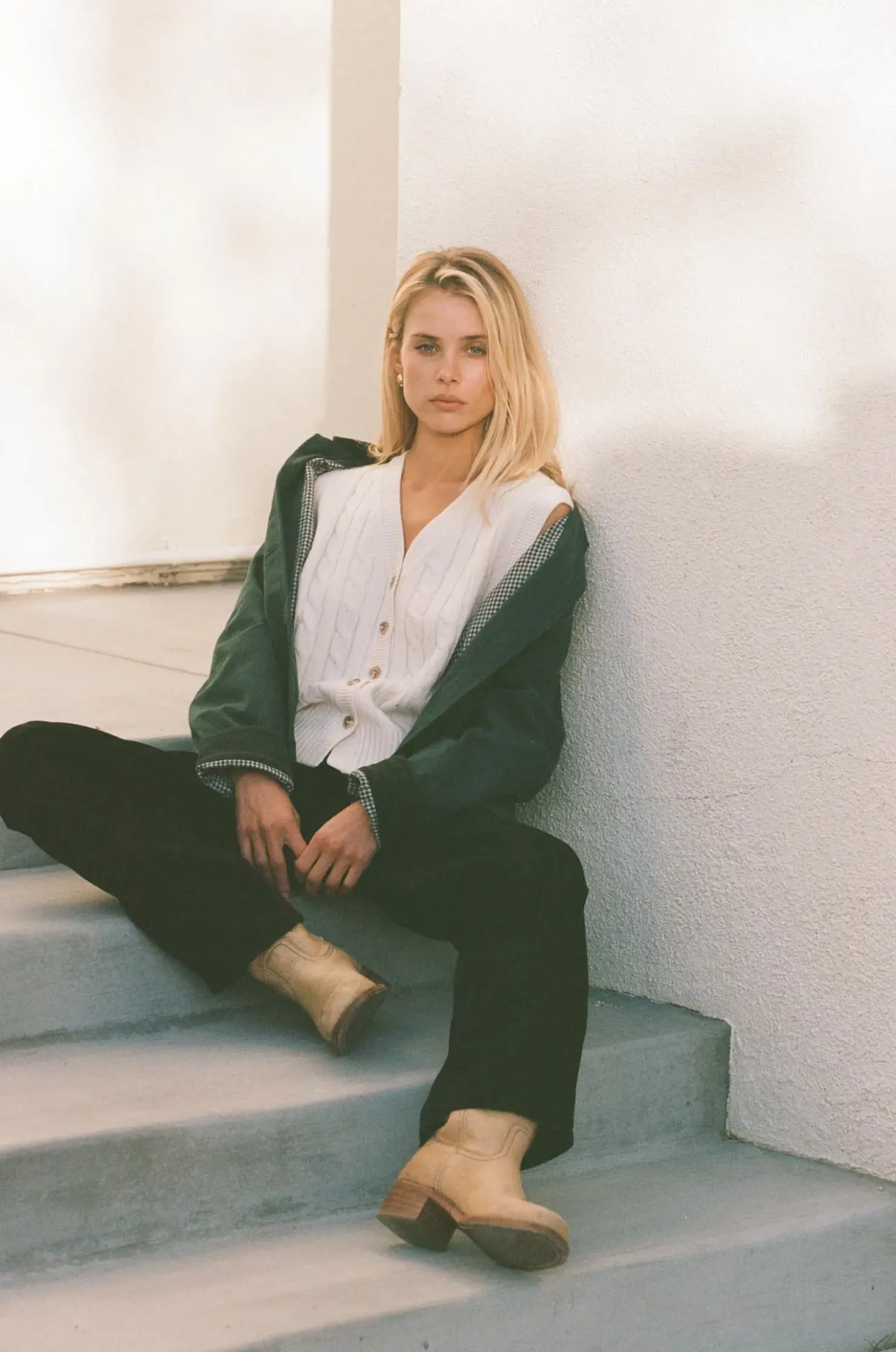 Add texture to your layers with the Desi Cable Knit Vest in Natural. This easy-to-wear piece, featuring intricate cable knit detailing, offers both warmth and style for transitional seasons.