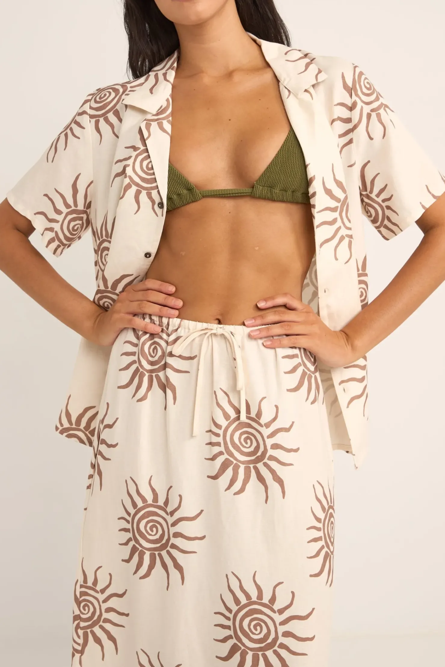 This Brown Seafarer Short Sleeve Shirt, made from a soft rayon-ramie blend, is a tribute to nautical ease. With a relaxed, boxy fit and a Cuban collar, it features a large-scale print that evokes the sprawling sea. Buttoned up or down, it’s designed for those drawn to evenings overlooked by a warm horizon.