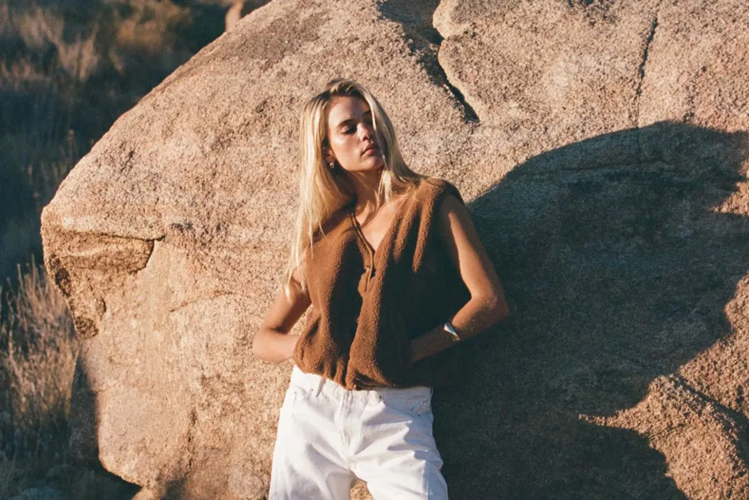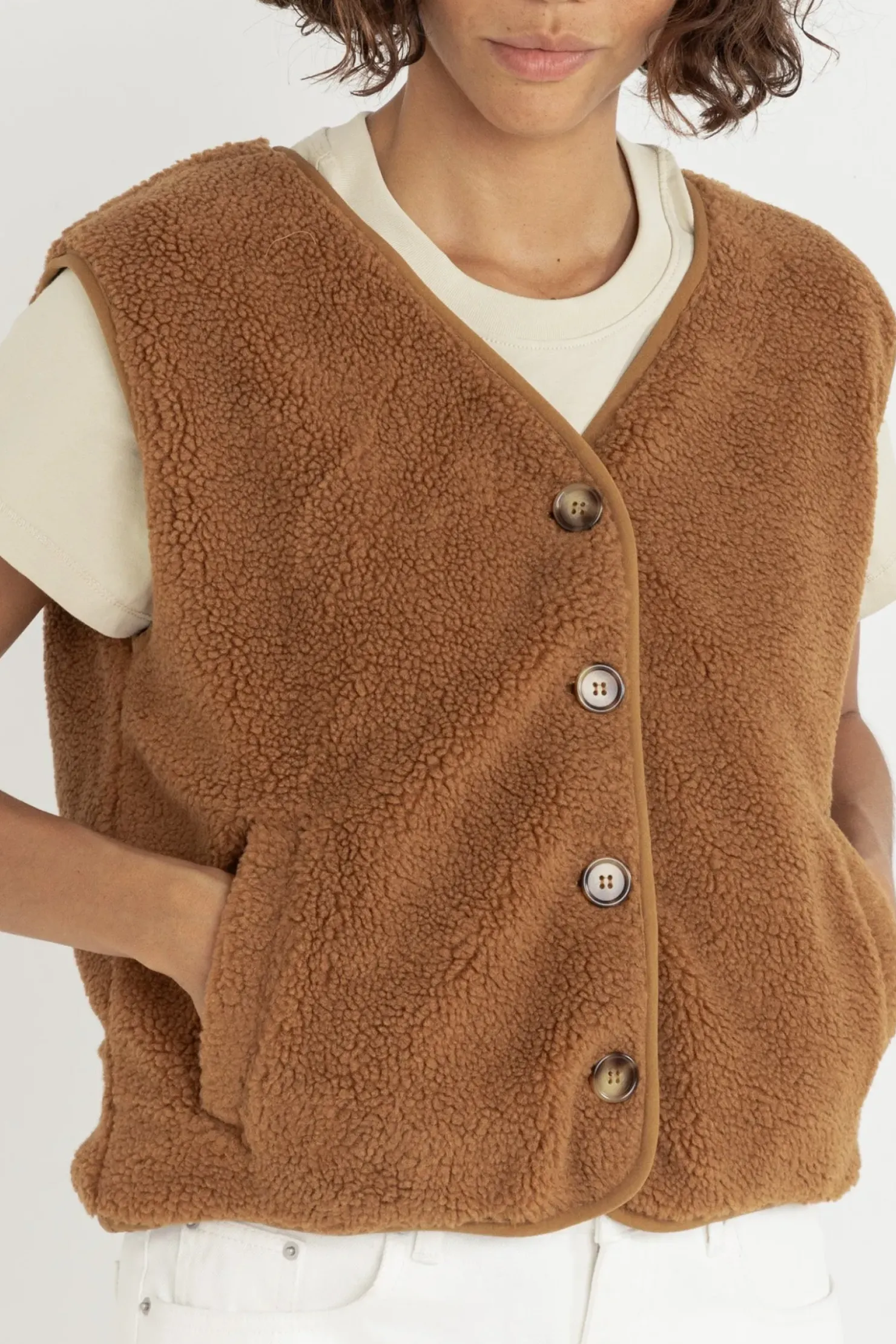 Wrap yourself in the Ella Sherpa Vest in Tobacco, crafted with plush sherpa fabric for ultimate warmth. This boxy-fit design features a horn button closure, combining practical functionality with coastal-inspired style.