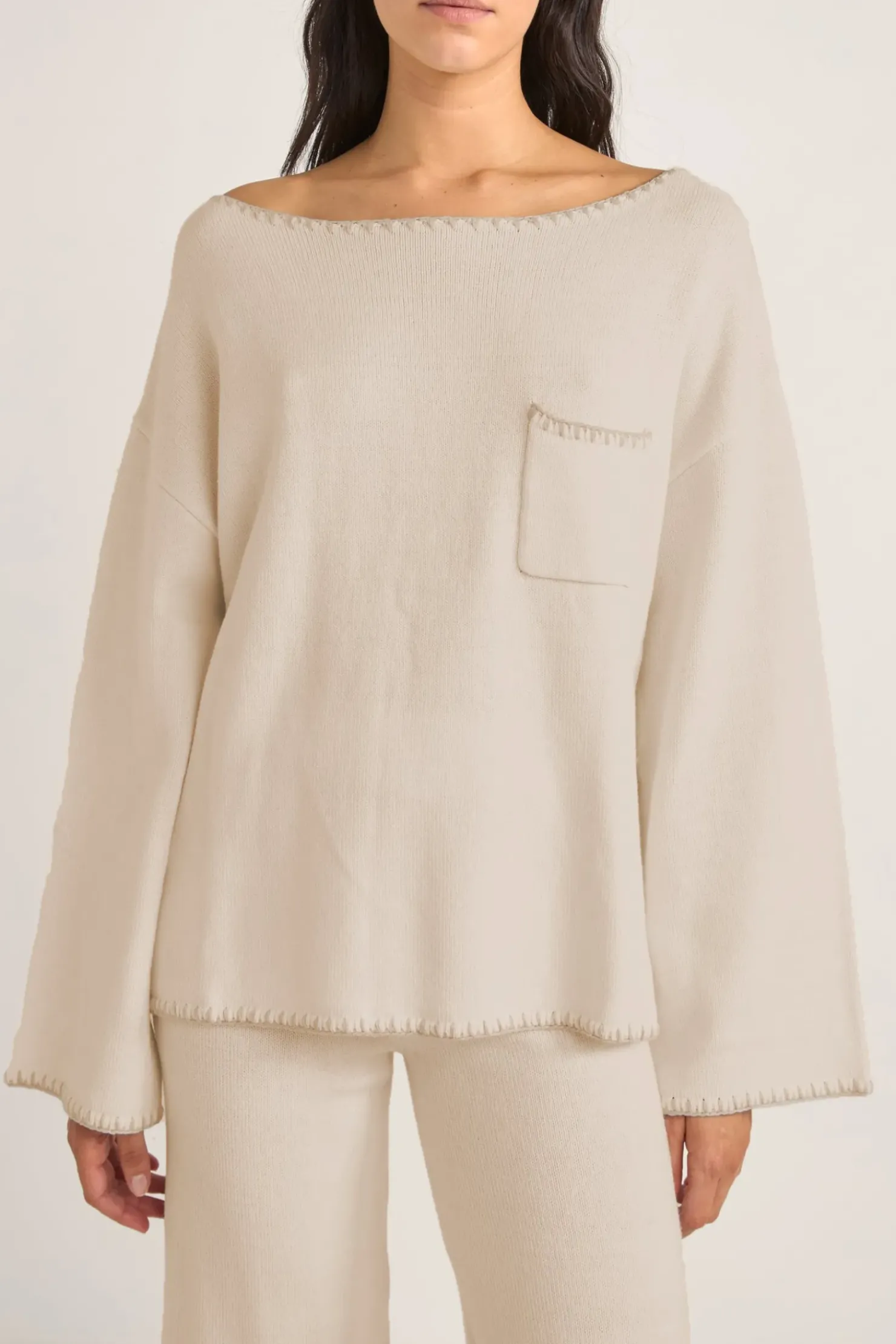 The Bondi Knit Jumper in Natural offers an oversized fit with a chest pocket and side slits for a relaxed yet stylish look. Ideal for layering on cooler coastal evenings.