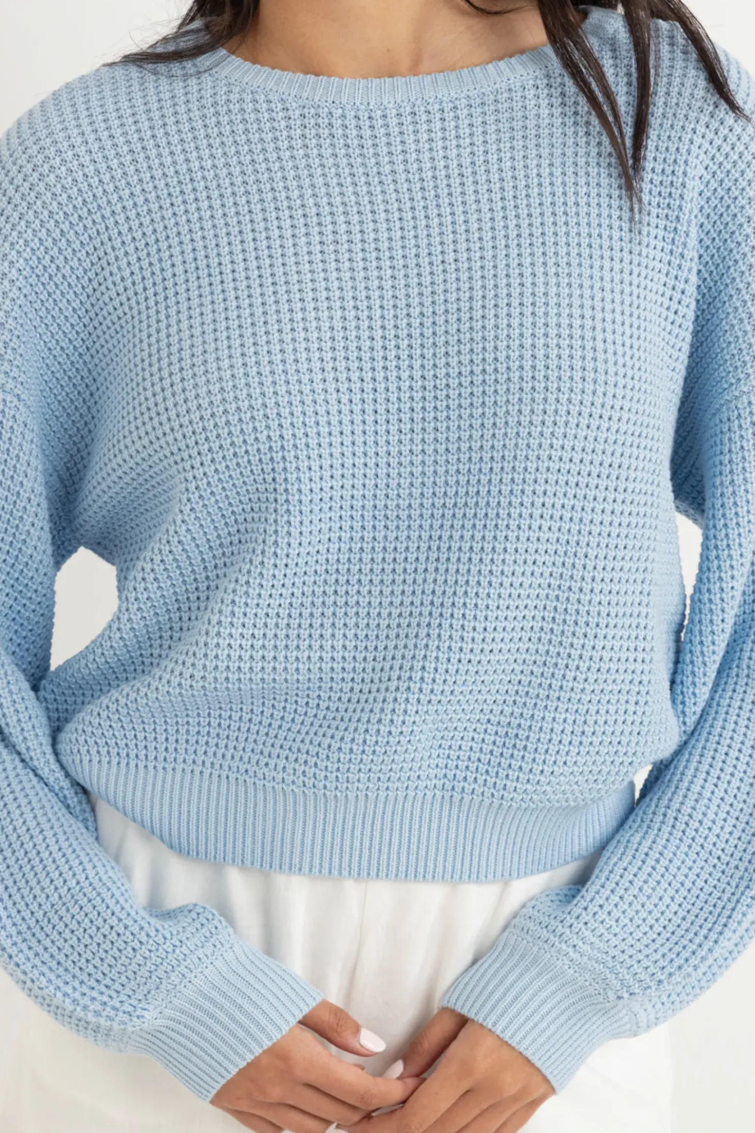 Soften into the Classic Knit Jumper in Blue, woven from a soft handed yarn blend to keep you cosy on the coolest of days.
