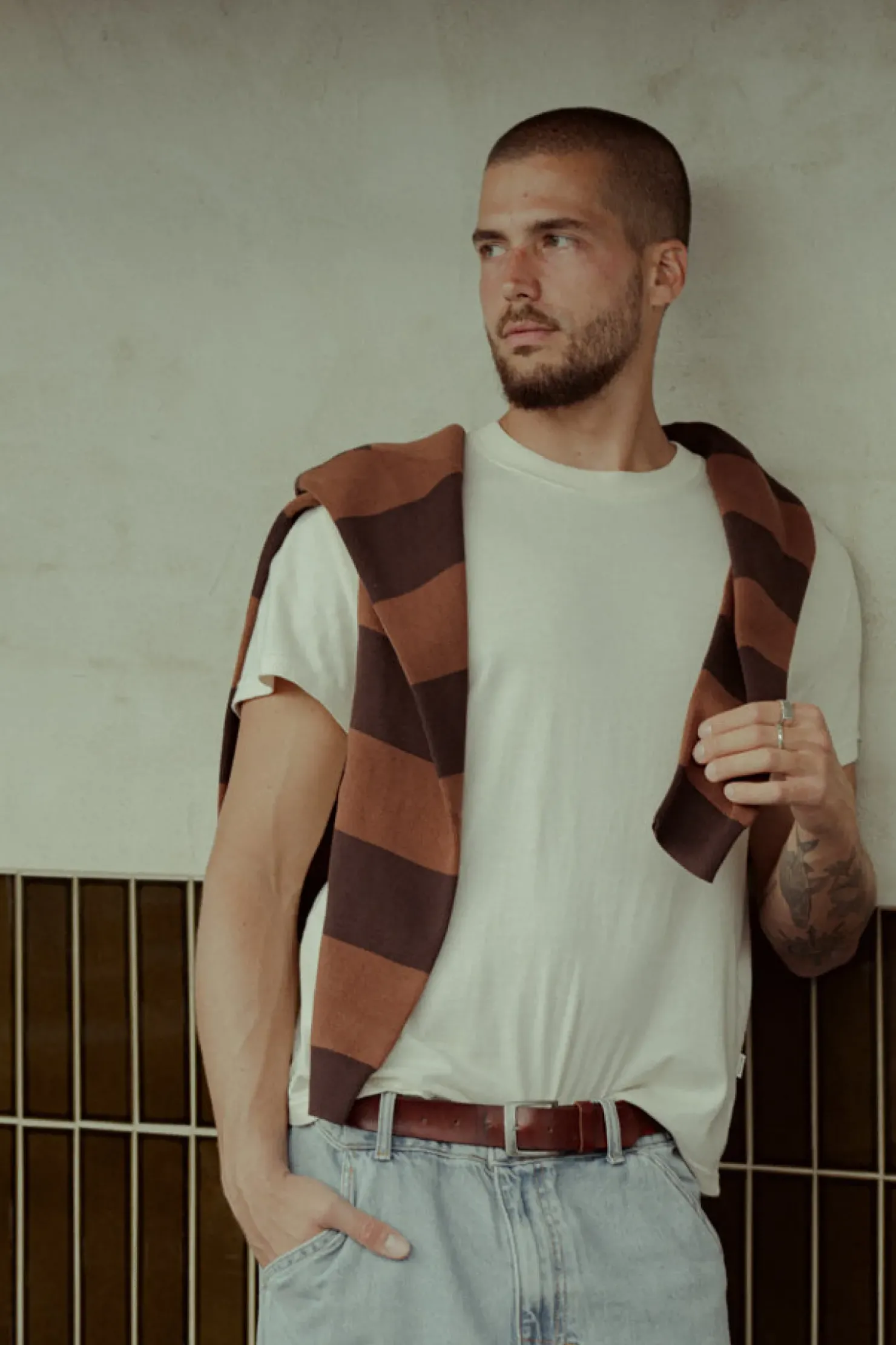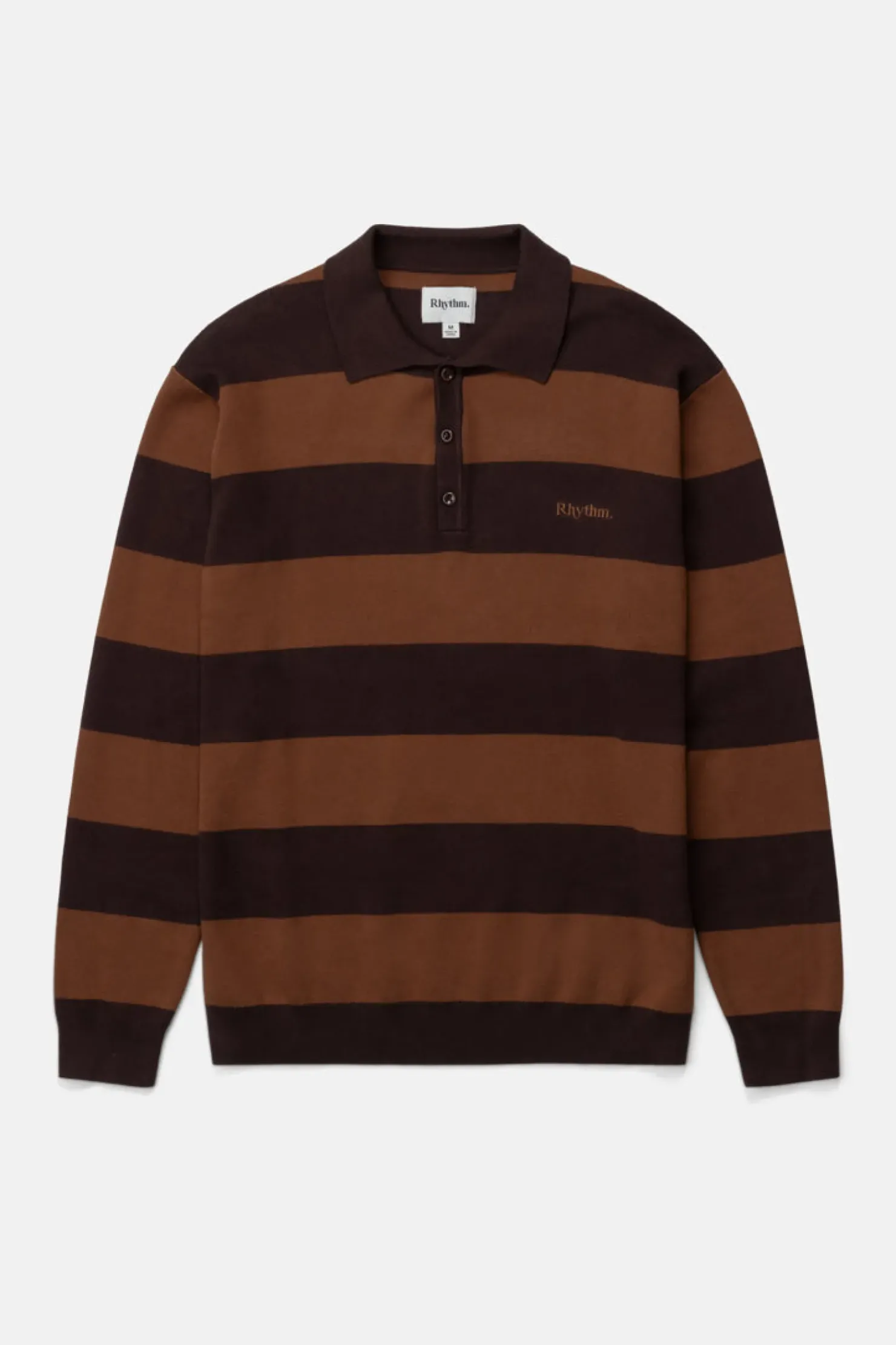 Long-sleeve knit polo featuring stripes and a contrast collar. Casual sophistication for cooler coastal days.