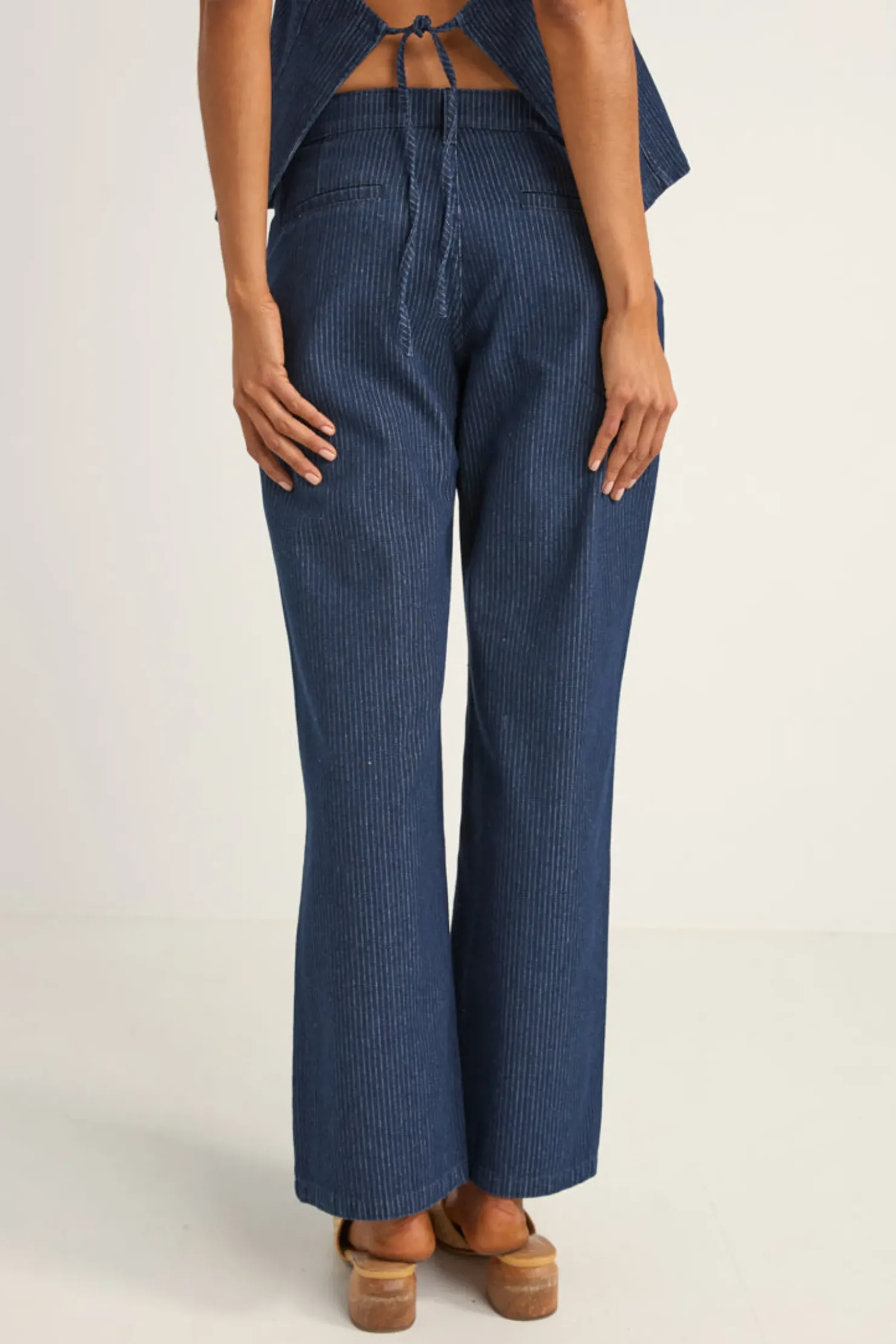 The Pinstripe Mid-Rise Pant offers a classic fit with a straight leg and subtle pinstripes. Ideal for both relaxed and polished looks, it’s a versatile wardrobe staple.