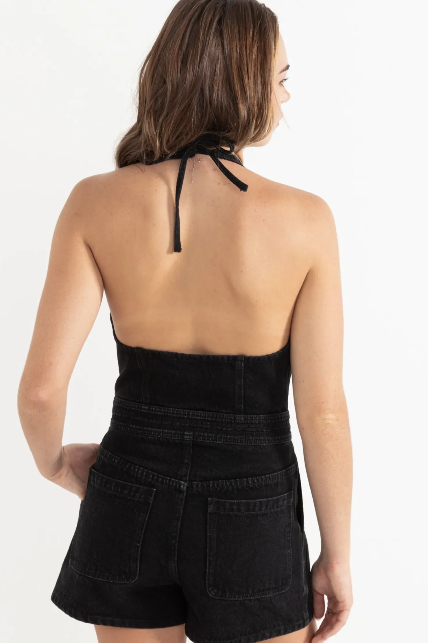 The Cassy Halter Denim Romper in Vintage Black redefines casual cool. Its easy-to-wear halter design is perfect for layering or wearing alone for a laid-back, on-trend look.