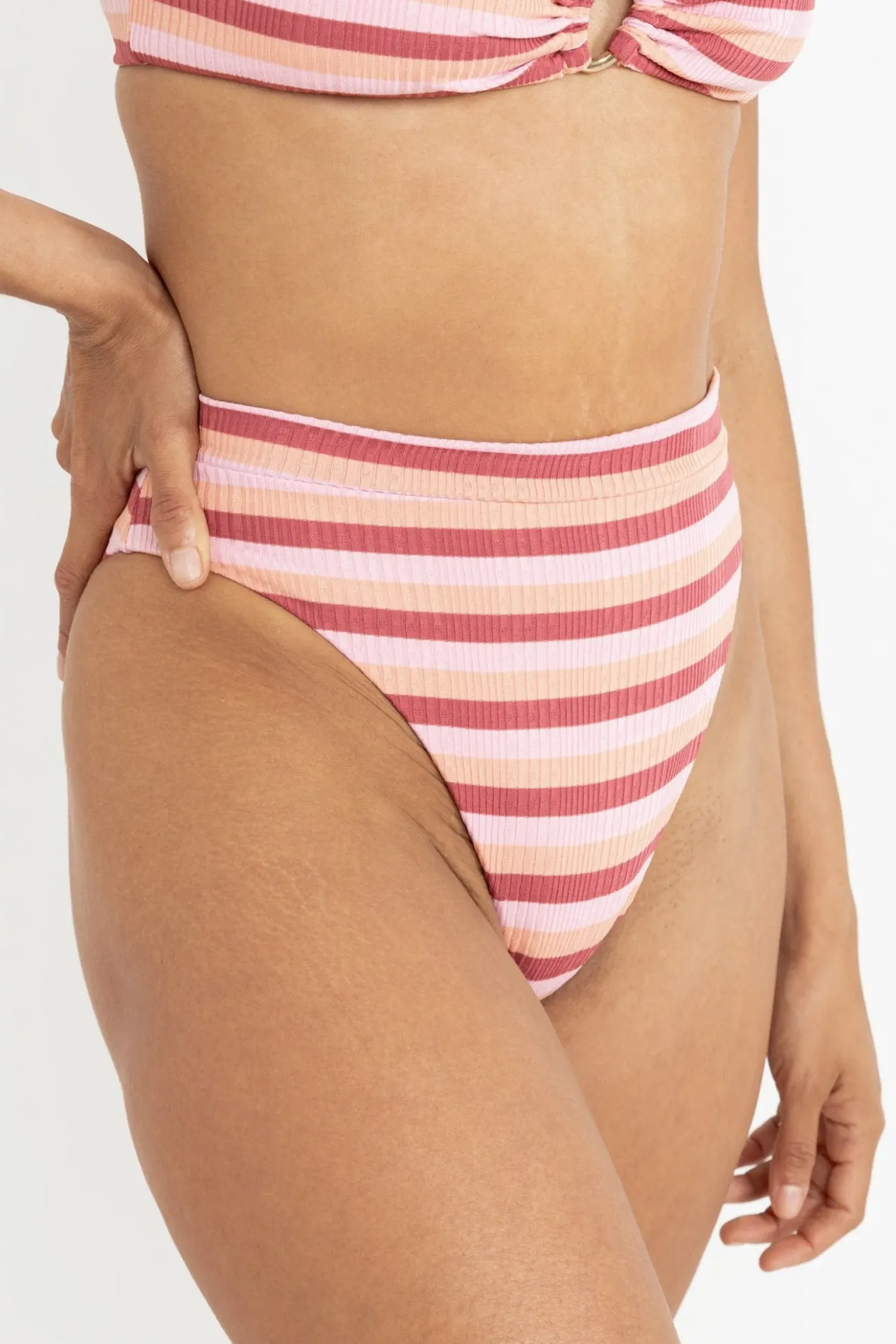 Classic meets contemporary with the Ibiza Stripe Rib High Waist Pant in Pink. Designed with a flattering fold-over waistband, this high-waisted style brings ultimate comfort and elegance to your swim collection, ideal for carefree days by the ocean.