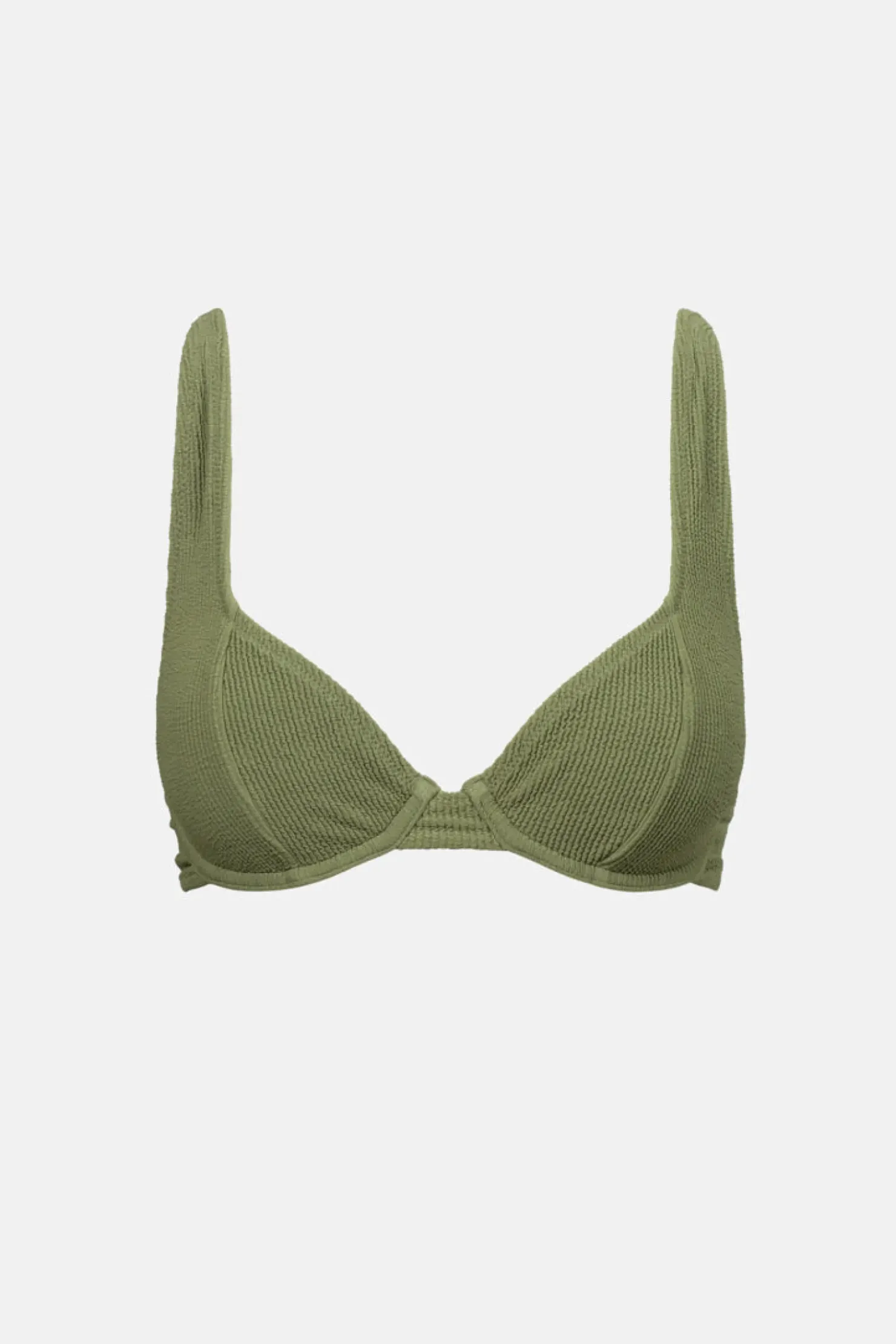 Designed for A-D cup sizes, the olive underwire top features adjustable straps, a tie-back closure, and gathered bust detailing for a comfortable and chic fit..