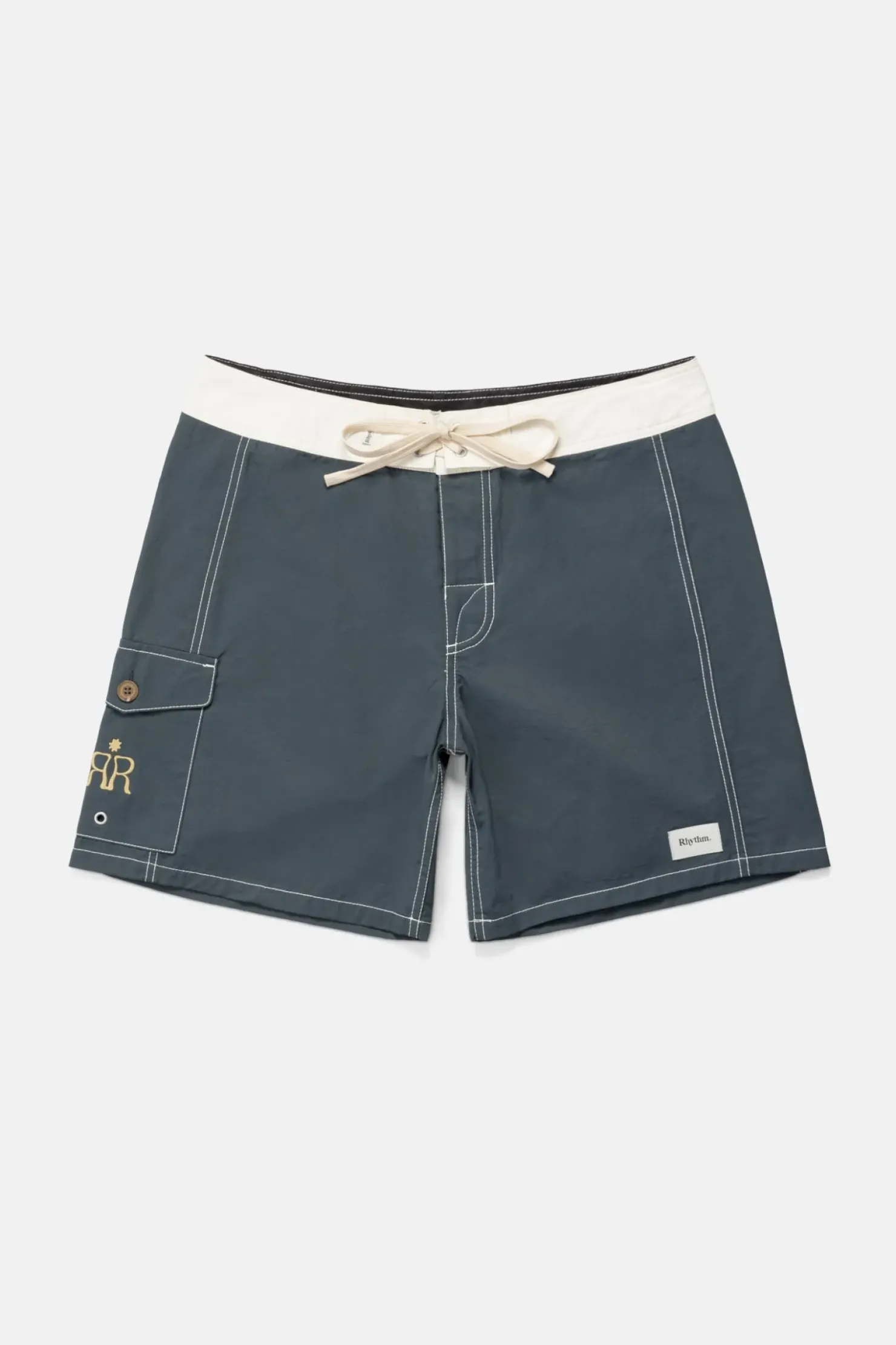 The Breakers Block Trunk in Stone Blue features a striking white contrast waistband and embroidered artwork on the right-hand pocket. Made for comfort and versatility, it’s a summer staple.