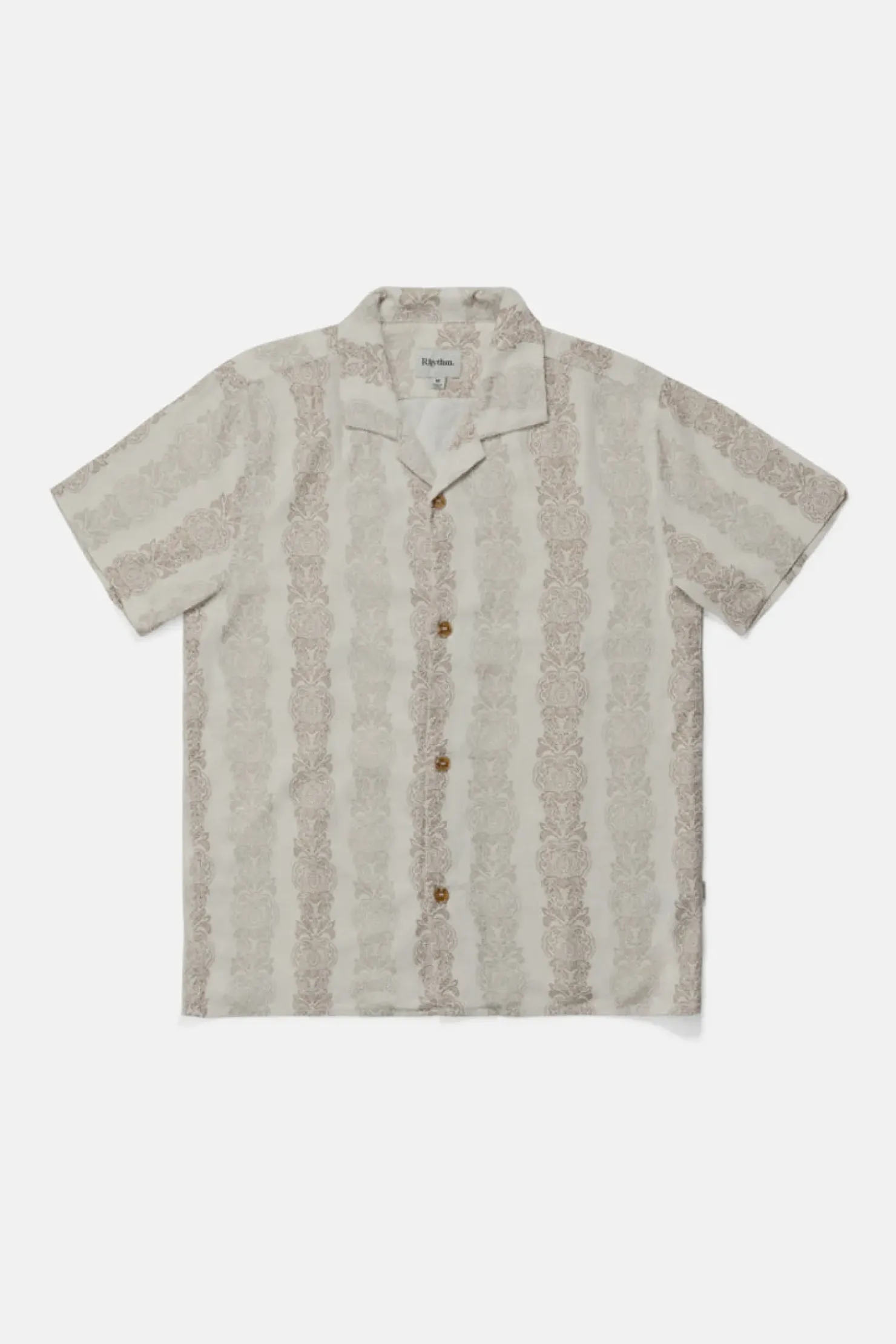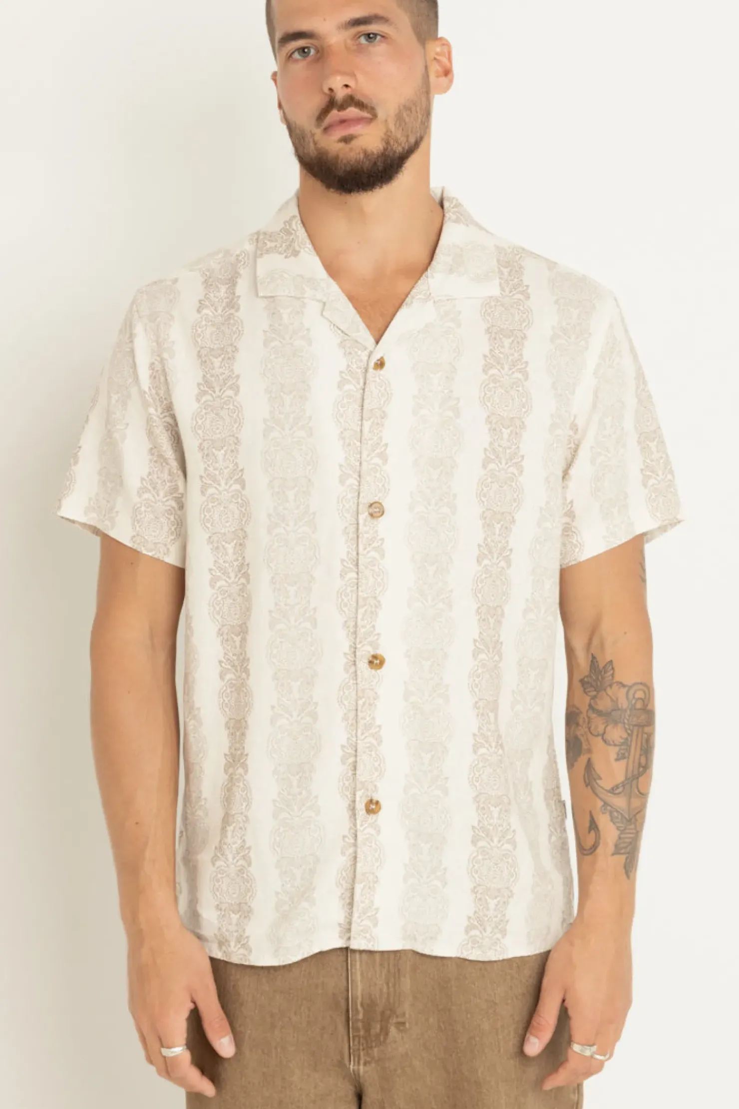 Explore floral sophistication in the Pineapple Stripe Ss Shirt Sand, crafted from 100% Rayon with a seasonal yardage print. Its Cuban collar and washed vintage feel make it a versatile choice for evening gatherings or daytime escapades.